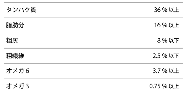 原材料:脱水ラムタンパク質(31%)、加水分解ラムタンパク質、バルドー米(16%)、トウモロコシ、精製鶏油、アンチョビミール(6%)、オキアミミール、ビール乾燥酵母、アンチョビオイル、ヌクレオチド酵母タンパク質、ミネラル類(銅,亜鉛.マンガン,セレン)、プレバイオティックマンナンオリゴ糖、海藻、ユッカ抽出物、クランベリーパウダー、オオバコ、ビタミン類 (A ,C,E,D3,ナイアシン)、アミノ酸類(タウリン)